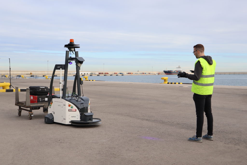 Por otro lado, el AGV de Robotnik estaba configurado con unos puntos distribuidos por el muelle en el que se realizó la demo y podía enviarse a los diferentes puntos haciendo gestos con los guantes (Figura 1.b).