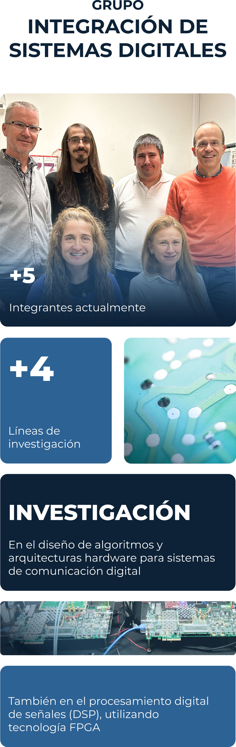 The group is focused in the design of hardware-oriented algorithms and architectures for FPGA-based digital signal processing and digital communication systems. Our main working areas are: Algorithms and architectures for advanced Forward Error Correction (FEC); OFDM-based Optical Communications Systems; Algorithms and architectures for FPGA-based software radios; FPGA-based DSP for ultrasound waves; and high-performance arithmetic and DSP operators for FPGA. |