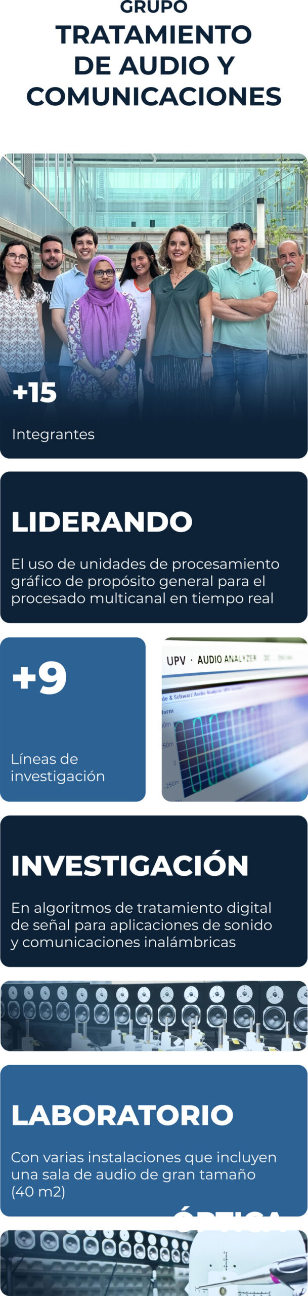 The Audio and Communications Signal Processing Group (GTAC) focuses its research in signal processing algorithms used in sound and wireless communication applications. Since 1998, GTAC members have managed and participated in different research projects related to Active Noise Control systems, Sound quality perception, Spatial Audio rendering and Multi-channel audio filtering in the area of sound processing, and related to Efficient MIMO receivers, Multi-user communications and coordinated systems in the area of wireless communications. Achieved results in these fields are available through the numerous papers listed in the publications menu.