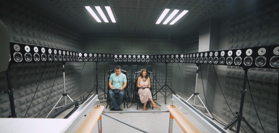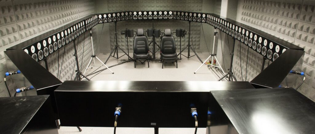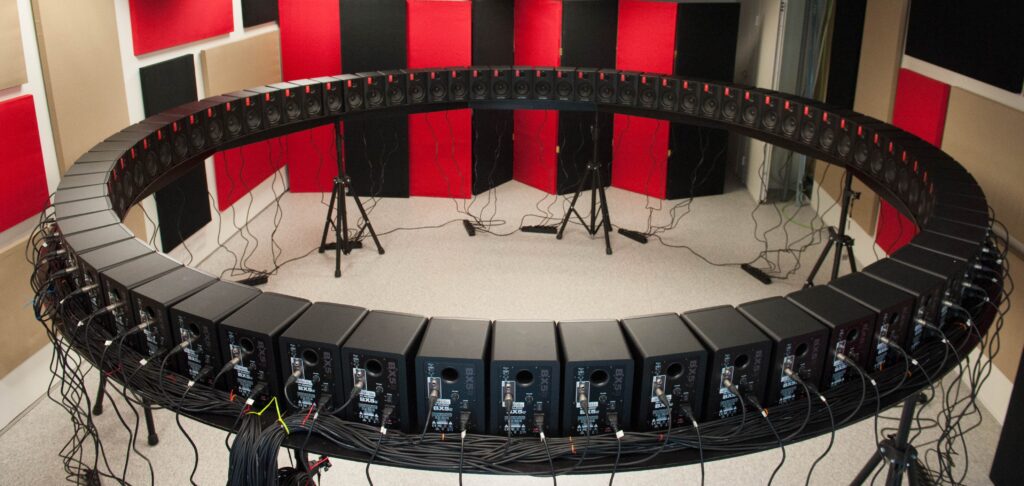 Multichannel setup in the GTAC Lab acoustic room, featuring 96 loudspeakers arranged on three sides and a 32-channel acquisition system. Designed for experiments on active noise control, spatial perception, and sound quality.